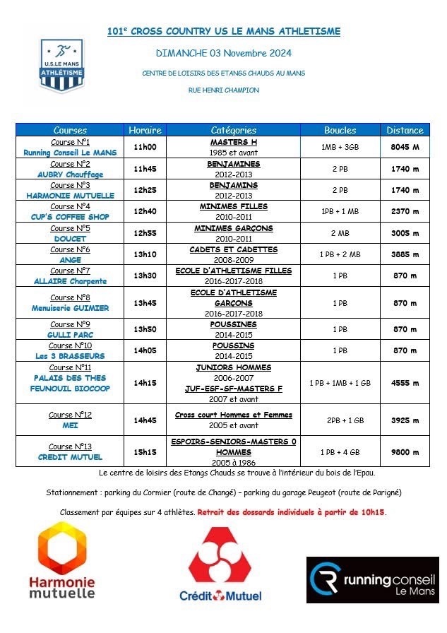 L'Union Sportive du Mans est heureuse de vous inviter au 102ème cross de la section athlétisme.