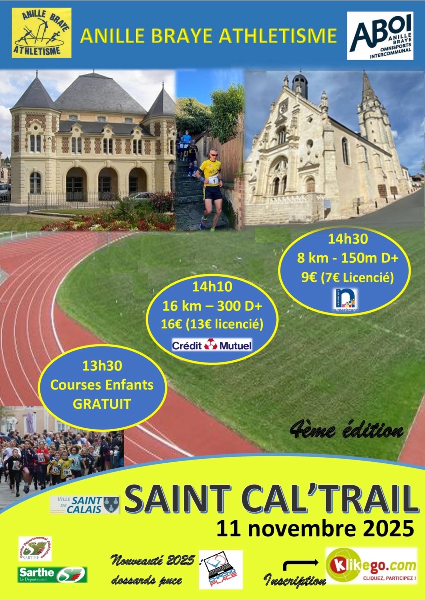 Mardi 11 novembre 2025, L’Anille Braye Athlétisme organise, dans les rues de Saint-Calais, la 4ème édition du Saint-Cal’Trail !